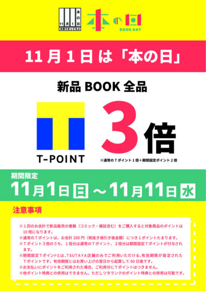 ◆新品ブック全品Tポイント3倍キャンペーン/書籍・雑誌・コミック全て、Tポイントが3倍になるお得なキャンペーン※期間/11月1日(日)~11月11日(水)
