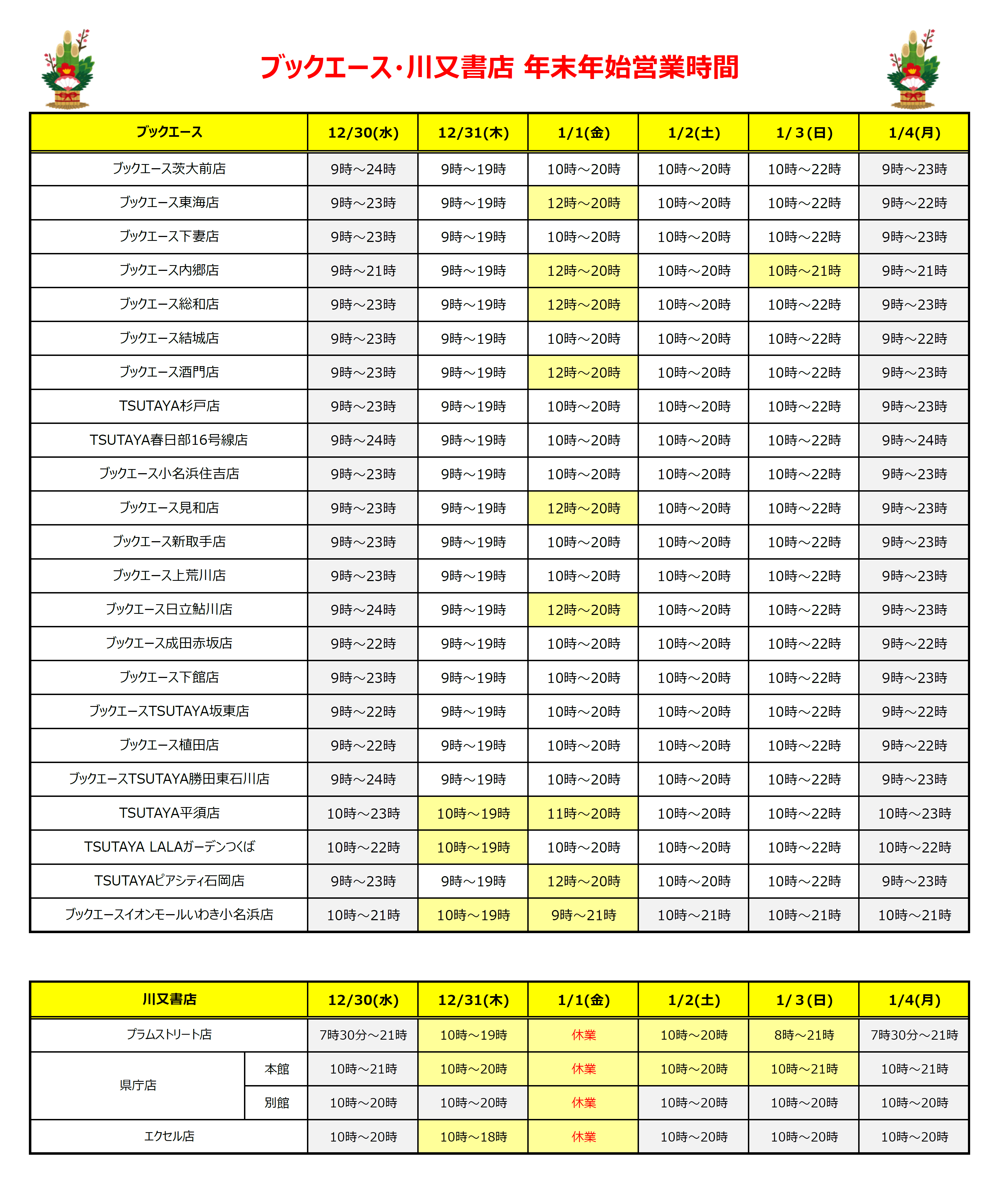 ブックエース川又書店年末年始営業時間2020-2021